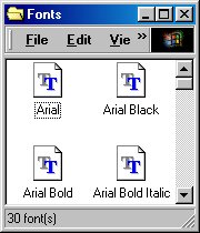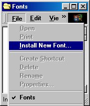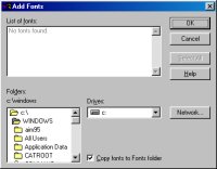After the fonts are loaded, they will be shown in the white text box labeled "List of Fonts". You can scroll through the "List of Fonts" list box and select the font you want to install. You can click on one font, or select more then one by holding down the control key as you are clicking on each font, or by clicking on the first font, holding down the shift key and clicking on the last font you want installed. You can also click on the "Select All" button. NOTE: If you try to install fonts which are already installed, you will be presented with a warning window telling you that you cannot install the font unless you first un-install it. This is a harmless warning which allows you to continue with the other fonts by simply pressing the <OK> button. After the font is selected (it will be highlighted), press the OK button. The font(s) will then be installed. When you are done, press the close <x> button on the top right corner of the window. You will be returned to the Fonts window, and the font you've just installed will be included there. You can now close the Fonts window, close the Control Panel, and close the "My Computer". |